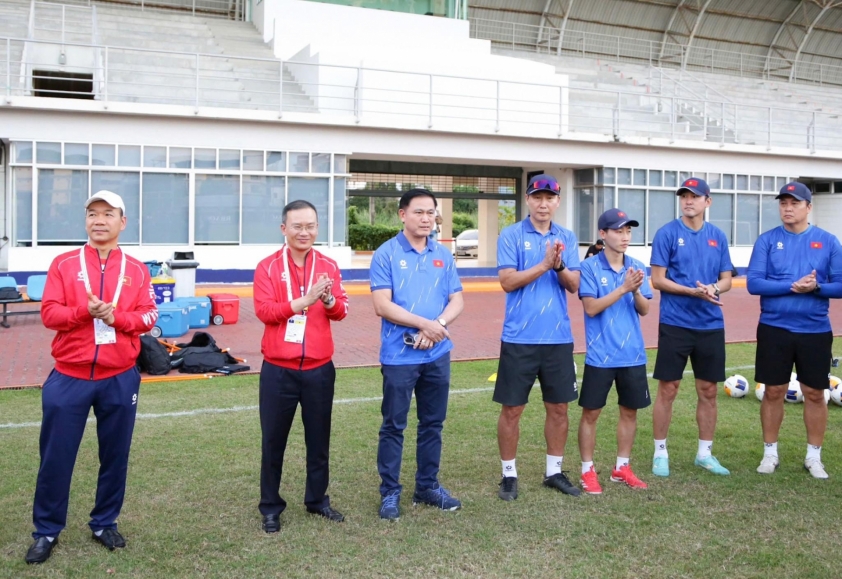Chiều 7/12 tại Bangkok, sau buổi tập của đội tuyển U22 Việt Nam, Trưởng đoàn Thể thao Việt Nam tại SEA Games 33 - ông Nguyễn Hồng Minh cùng Phó Trưởng đoàn Hoàng Quốc Vinh đã tới thăm, động viên tinh thần toàn đội trong giai đoạn chuẩn bị cho trận đấu then chốt gặp U22 Malaysia.