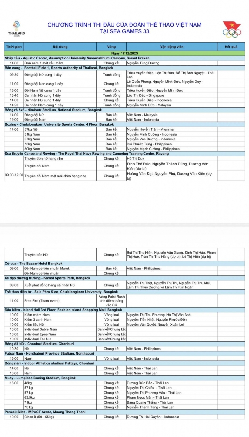 Ngày 17/12 tiếp tục được xem là một trong những ngày thi đấu then chốt của Đoàn Thể thao Việt Nam tại SEA Games 33, trong đó đáng chú ý có trận tranh HCV môn bóng đá nữ.