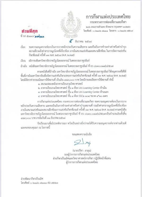 Trước tình hình này, ông Preecha Laluln, Phó Thống đốc phụ trách thể thao thành tích cao và khoa học thể thao, người đang điều hành thay Quyền Thống đốc SAT, đã gửi văn bản giải trình đến Đại học Valaya Alongkorn ngày 5/12/2025.