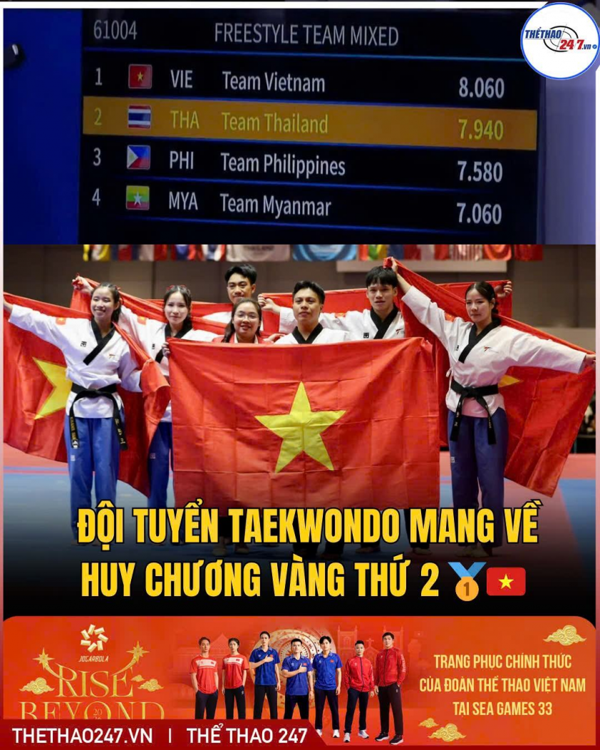 Taekwondo Việt Nam đã ghi dấu ấn mạnh mẽ khi giành HCV ở nội dung quyền biểu diễn sáng tạo hỗn hợp nam nữ tự do, cũng là tấm HCV thứ hai của Đoàn Thể thao Việt Nam tại SEA Games 33.