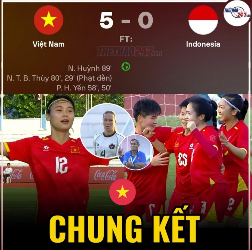 Tuyển nữ Việt Nam thắng Indonesia 5-0 ở bán kết SEA Games 33, qua đó chính thức giành quyền vào chung kết lần thứ 11 liên tiếp. Ngay từ những phút đầu, Việt Nam đã áp đảo hoàn toàn. Bích Thùy mở tỷ số ở phút 28 trên chấm phạt đền, trước khi Indonesia suýt gỡ hòa với cú dứt điểm chéo góc dội cột. Dù vậy, hiệp một khép lại với ưu thế rõ rệt dành cho thầy trò HLV Mai Đức Chung.
