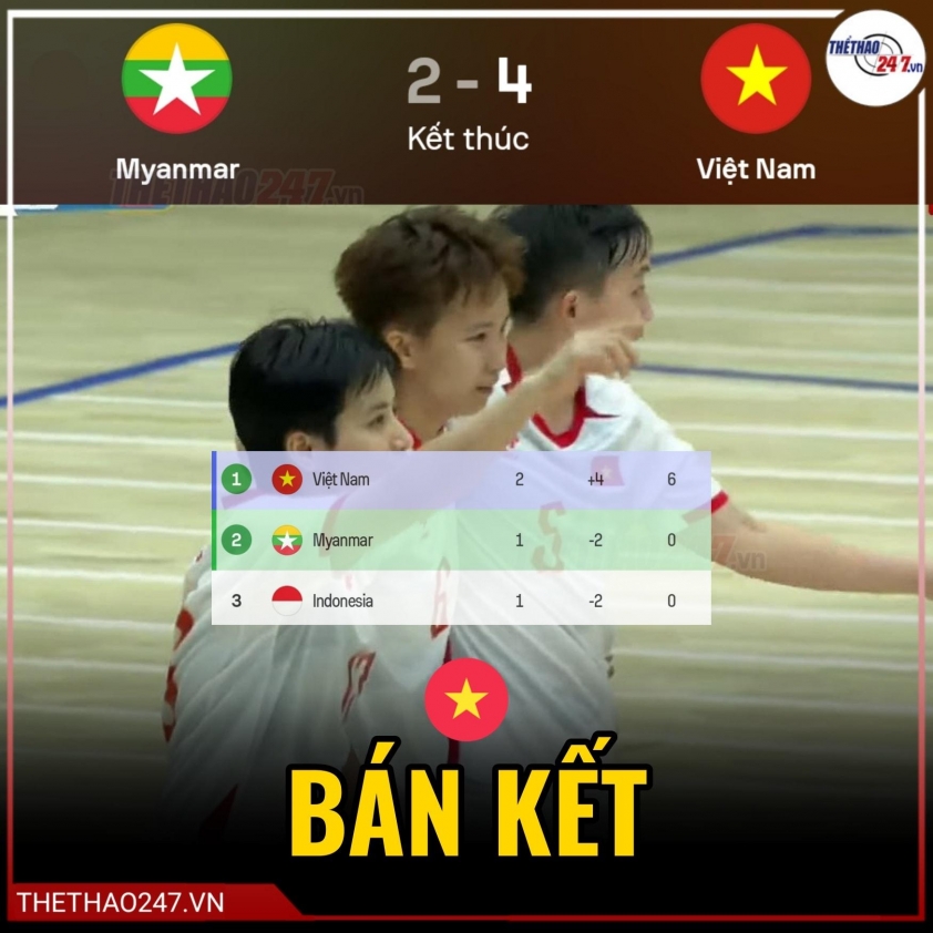 ĐT futsal nữ Việt Nam đã ngược dòng đánh bại Myanmar với tỷ số 4-2 để chính thức giành vé vào bán kết SEA Games 33. Ngay từ đầu trận, các cô gái Việt Nam chơi pressing tầm cao, tạo ra nhiều cơ hội nguy hiểm nhưng không thể ghi bàn, trước khi bất ngờ để El El Kyaw mở tỷ số cho Myanmar ở phút 10.