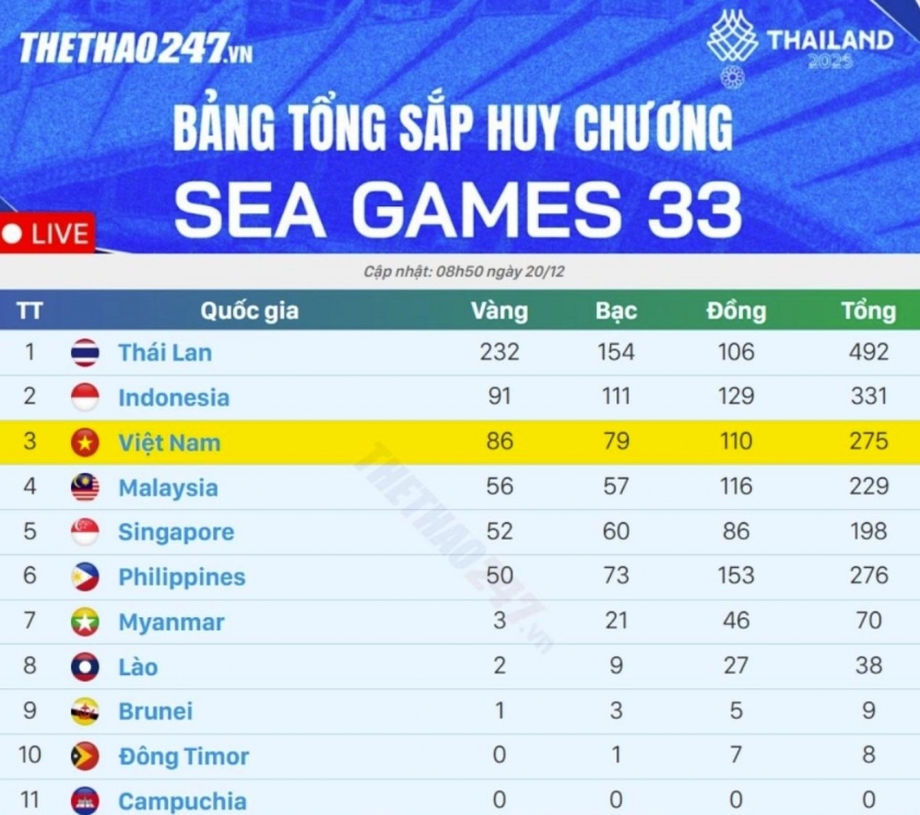 Khép lại hành trình tại SEA Games 33, Đoàn Thể thao Việt Nam giành 87 Huy chương Vàng, 81 Huy chương Bạc và 110 Huy chương Đồng, xếp thứ ba toàn đoàn, sau chủ nhà Thái Lan và Indonesia. Nếu tính thêm 5 Huy chương Vàng ở các môn biểu diễn, tổng số Huy chương Vàng đạt 92, qua đó vượt chỉ tiêu 90 Huy chương Vàng được giao trước Đại hội. Đây là kết quả đáng ghi nhận trong bối cảnh lực lượng tham dự của Việt Nam chỉ đứng thứ 6 toàn khu vực.