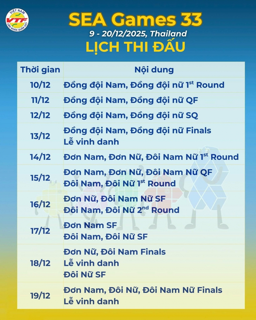 (Lịch thi đấu tennis) - Cập nhật lịch thi đấu môn tennis SEA Games 33 diễn ra từ ngày 9/12 đến 20/12 tại Nonthaburi, Thái Lan, có sự góp mặt của đội tuyển quần vợt Việt Nam.