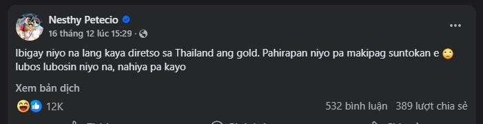 Sau khi để thua võ sĩ Indonesia ở trận bán kết hạng 63kg nữ, Petecio đã đăng tải dòng trạng thái đầy giận dữ trên mạng xã hội: “Chỉ cần đưa HCV trực tiếp cho Thái Lan là xong. Thi đấu làm gì nữa cho thêm phần khó khăn khi kết quả cũng không thay đổi. Thật xấu hổ!!!”. Phát ngôn này nhanh chóng lan truyền mạnh mẽ, phản ánh sự phẫn nộ tột độ của một VĐV từng đứng trên bục vinh quang Olympic.