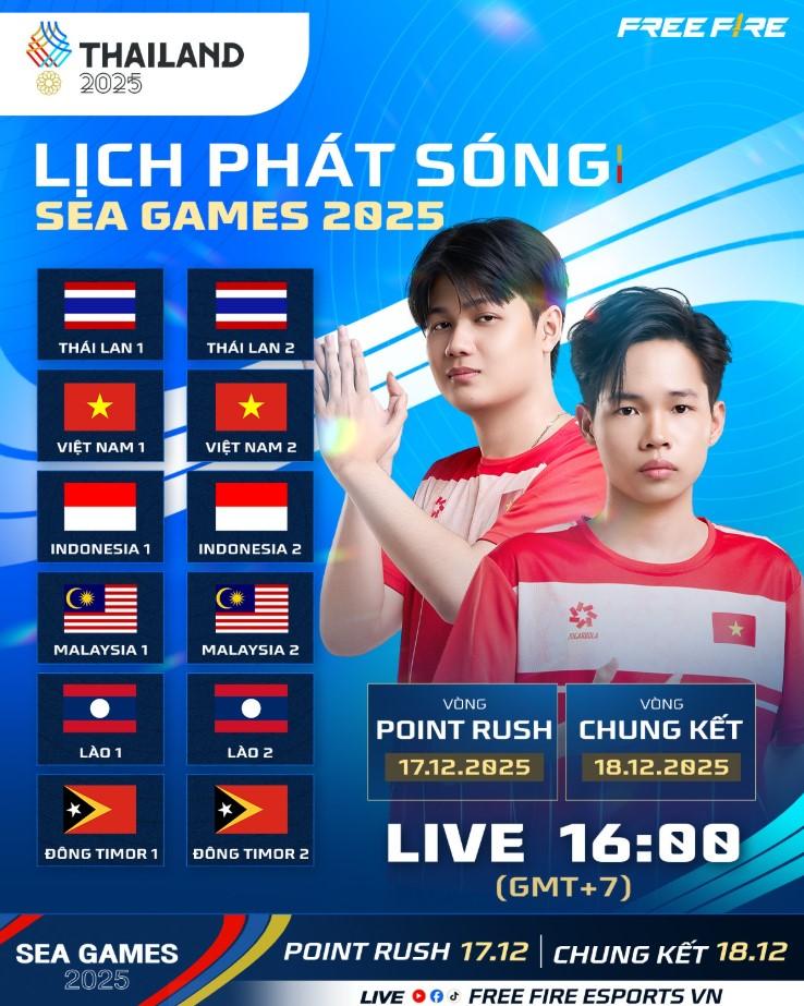 Tại SEA Games 33 sắp tới, Free Fire sẽ là một trong những bộ môn có tranh huy chương và rất được quan tâm. Với tính chất của dòng game bắn súng sinh tồn là yếu tố ngẫu nhiên tương đối lớn thì Free Fire Việt Nam vẫn có thể nuôi hy vọng giành huy chương tại SEA Games năm nay. Theo đó, các đội tuyển khu vực Đông Nam Á sẽ tranh tài ở hai vòng đấu quan trọng: Point Rush và Chung kết, được phát sóng trực tiếp lúc 16:00 (GMT+7) ngày 17 & 18/12/2025 trên hệ thống kênh Esports chính thức của Free Fire VN.