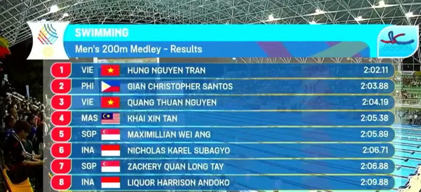 Hưng Nguyên về nhất với thành tích 2 phút 02 giây 11, vượt qua đối thủ người Philippines Gian Christopher Santos (2 phút 03 giây 88) và người đồng đội Nguyễn Quang Thuấn (2 phút 04 giây 19). Kết quả này không chỉ khẳng định vị thế hàng đầu của Hưng Nguyên ở nội dung sở trường, mà còn mở màn đầy thuận lợi cho đoàn thể thao Việt Nam trong hành trình chinh phục các đường bơi tại kỳ đại hội năm nay.