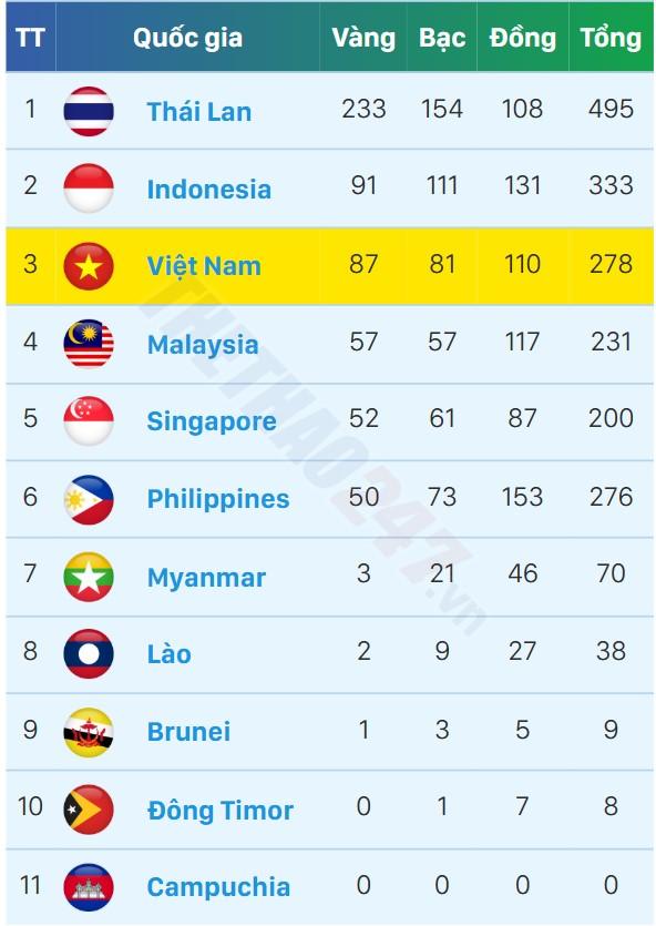 Theo thống kê, chỉ hai lần trong lịch sử Indonesia từng vượt mốc 90 HCV ở những kỳ SEA Games không tổ chức trên sân nhà năm 1989 tại Malaysia (102 HCV) và năm 1991 tại Philippines (92 HCV). Sau 34 năm, dấu mốc vinh quang ấy mới được tái lập, phản ánh sự tiến bộ vượt bậc của thể thao xứ vạn đảo trong thời gian gần đây.