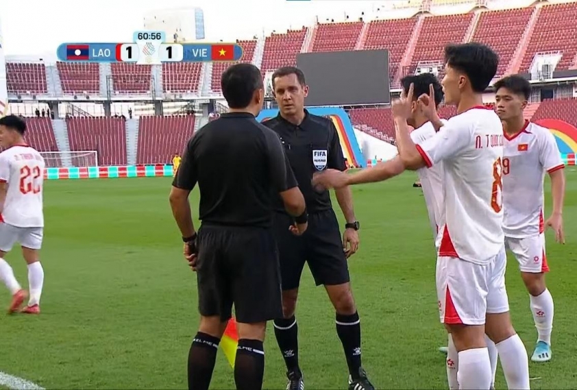 Trọng tài Rustam Lutfullin “bẻ còi” công nhận bàn thắng gây tranh cãi của Nguyễn Đình Bắc, giúp U22 Việt Nam đánh bại U22 Lào 2-1 trong trận ra quân SEA Games 33.