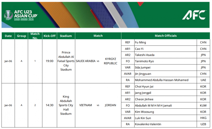 Liên đoàn Bóng đá châu Á (AFC) mới đây đã chính thức công bố danh tính tổ trọng tài làm nhiệm vụ ở trận ra quân của U23 Việt Nam với U23 Jordan tại VCK U23 châu Á 2026.