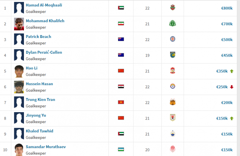 Theo cập nhật mới nhất từ Transfermarkt, danh sách những thủ môn U23 có giá trị chuyển nhượng cao nhất tại VCK U23 châu Á 2026 quy tụ nhiều gương mặt đến từ các nền bóng đá hàng đầu châu lục như UAE, Iran hay Australia. Dẫn đầu là Hamad Al-Meqbaali (U23 UAE, 800.000 euro), tiếp theo là Mohammad Khalifeh (U23 Iran, 700.000 euro) cùng 2 đại diện của Australia.