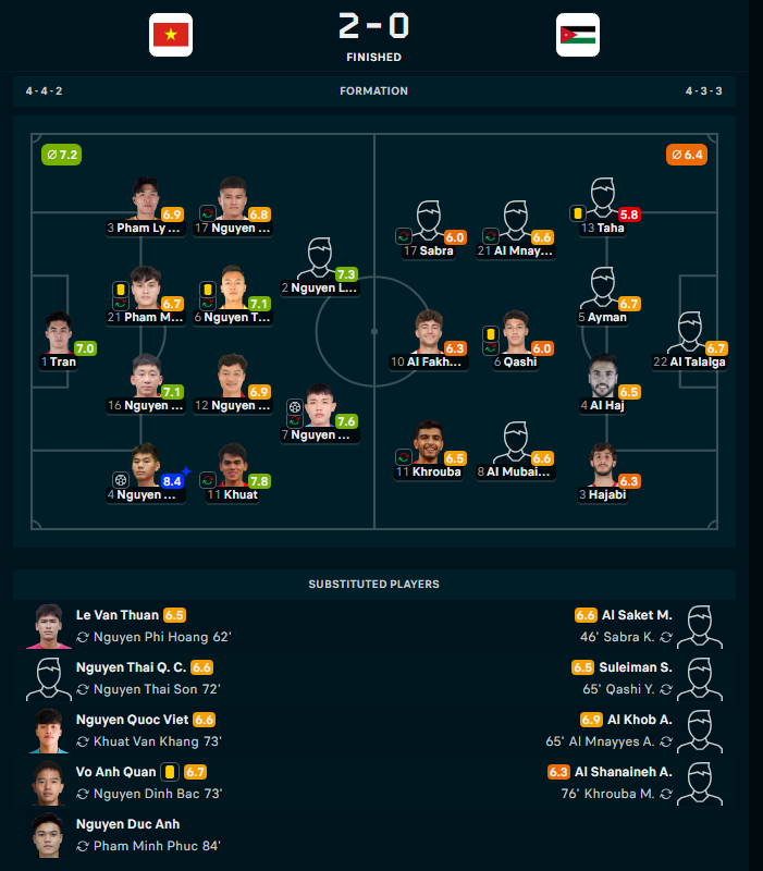 Ngoài ra, Thái Sơn được chấm 7,1 điểm nhờ khả năng thu hồi bóng và bọc lót hiệu quả cho hàng thủ. Trong khi đó, Văn Khang được chấm 7.8 điểm dù không thi đấu trọn vẹn 90 phút.