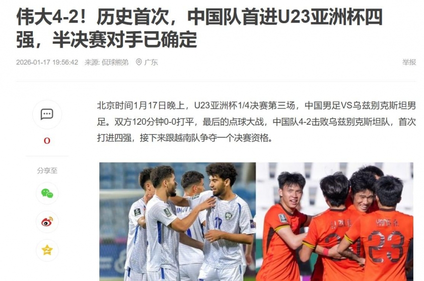 Chiến thắng trước U23 Uzbekistan không chỉ đưa U23 Trung Quốc lần đầu tiên vào bán kết U23 châu Á, mà còn khiến truyền thông nước này đồng loạt “dậy sóng”, đặc biệt khi đối thủ tiếp theo của họ là U23 Việt Nam.