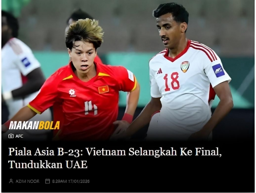 U23 Việt Nam gây tiếng vang tại châu Á khi vượt qua UAE, khiến truyền thông Malaysia đồng loạt dành sự chú ý và đánh giá cao bản lĩnh thi đấu.