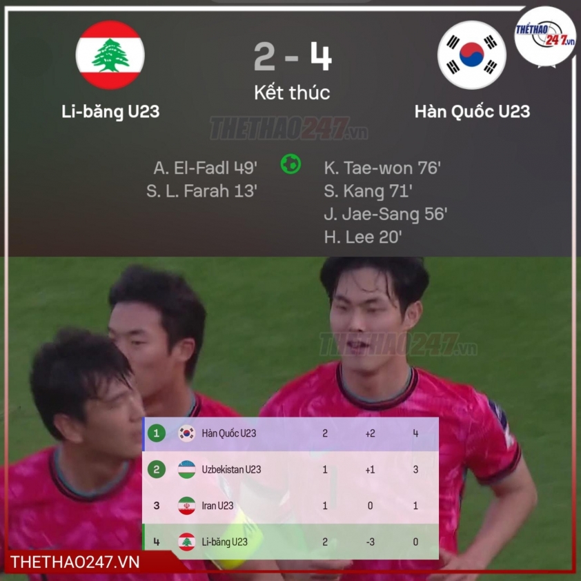 Thất bại 2-4 trước U23 Hàn Quốc tối 10/1 tại Riyadh đã khép lại mọi hy vọng mong manh của đại diện Tây Á. Trước đó, họ từng chơi một trận đáng khen khi đối đầu U23 Uzbekistan nhưng vẫn gục ngã 2-3. Hai kết quả này khiến Lebanon không còn cơ hội chen chân vào 1 trong 2 vị trí dẫn đầu bảng C.