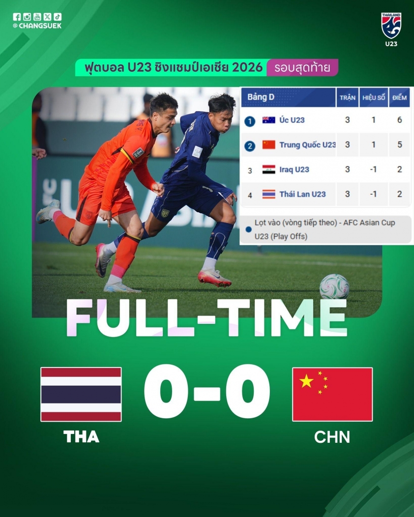 U23 Thái Lan đã khép lại hành trình tại Giải vô địch U23 châu Á 2026 ngay từ vòng bảng, một kết quả gây tiếc nuối với người hâm mộ xứ chùa Vàng. Sau trận hòa không bàn thắng trước U23 Trung Quốc ở lượt cuối, thầy trò HLV Thawatchai Damrong-ongtrakul chỉ giành được 2 điểm và đứng cuối bảng D, chính thức bị loại sớm.
