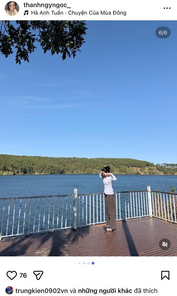 Cùng thời điểm đó, Thiên Thanh cũng đăng tải loạt ảnh check-in tại Biển Hồ (Pleiku, Gia Lai) với bối cảnh và trang phục trùng khớp. Trung Kiên để lại tương tác “thả tim” dưới bài đăng của cô, chi tiết được xem là củng cố thêm những nghi vấn xoay quanh mối quan hệ giữa hai người.