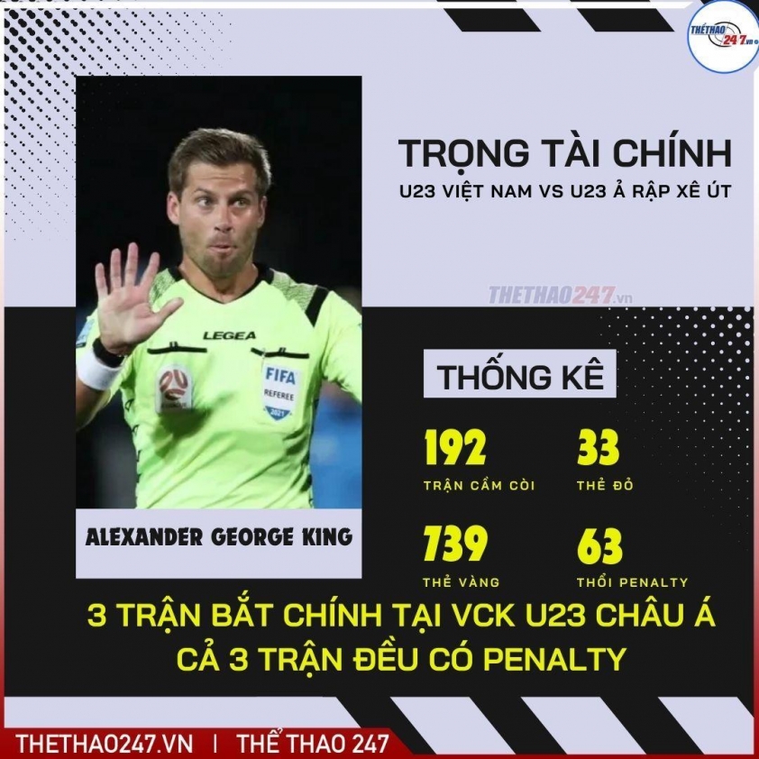 Trước khi xuất hiện tại VCK U23 châu Á 2026, Alexander George King đã hai lần làm nhiệm vụ ở giải đấu này vào các năm 2022 và 2024. Thống kê cho thấy ông là trọng tài khá “nặng tay” nhưng nhất quán, với trung bình gần 4 thẻ vàng mỗi trận và thường đưa ra quyết định dứt khoát trong các tình huống nhạy cảm.