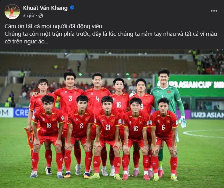 Trên trang cá nhân, Văn Khang đăng tải hình ảnh tập thể U23 Việt Nam kèm dòng chia sẻ ngắn gọn nhưng giàu cảm xúc: “Cảm ơn tất cả mọi người đã động viên. Chúng ta còn một trận phía trước, đây là lúc chúng ta nắm tay nhau và tất cả vì màu cờ trên ngực áo”. Thông điệp này nhanh chóng thu hút sự chú ý, nhận được nhiều lời động viên và chia sẻ từ người hâm mộ.