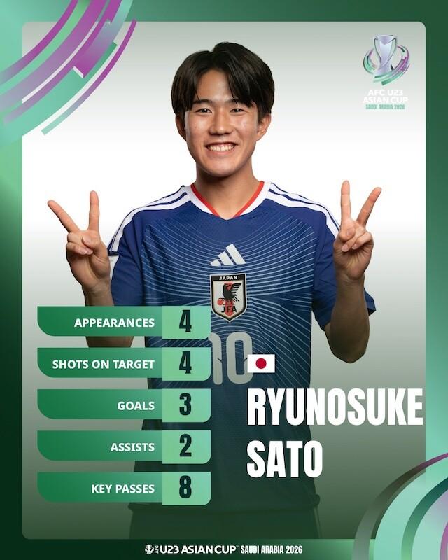 Ở giải đấu năm nay, Sato được xem là gương mặt nổi bật nhất bên phía U23 Nhật Bản. Tiền vệ tấn công thuộc biên chế FC Tokyo không chỉ tạo ra sức ảnh hưởng lớn lên lối chơi, mà còn nằm trong nhóm kiến tạo hàng đầu giải với 10 cơ hội được tạo ra, cho thấy khả năng kết nối và mở ra khoảng trống cực kỳ đáng gờm.
