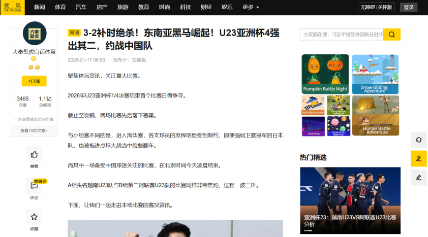 Trang Sohu giật title: ““Ngựa ô” Đông Nam Á trỗi dậy! Hai suất vào bán kết U23 châu Á đã lộ diện, hẹn đấu Trung Quốc”.