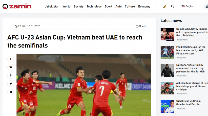 Một trong những đối thủ tiềm năng của U23 Việt Nam ở bán kết là Uzbekistan cũng không thể ngồi yên. Báo chí Uzbekistan dành sự chú ý lớn cho cuộc so tài giữa U23 Việt Nam và U23 UAE ở tứ kết U23 châu Á 2026, gọi đây là một trong những trận đấu kịch tính nhất vòng knock-out. Theo nhận định từ truyền thông Trung Á, Việt Nam không thắng nhờ may mắn, mà thắng nhờ “tinh thần không gục ngã” và khả năng tận dụng thời điểm quyết định.