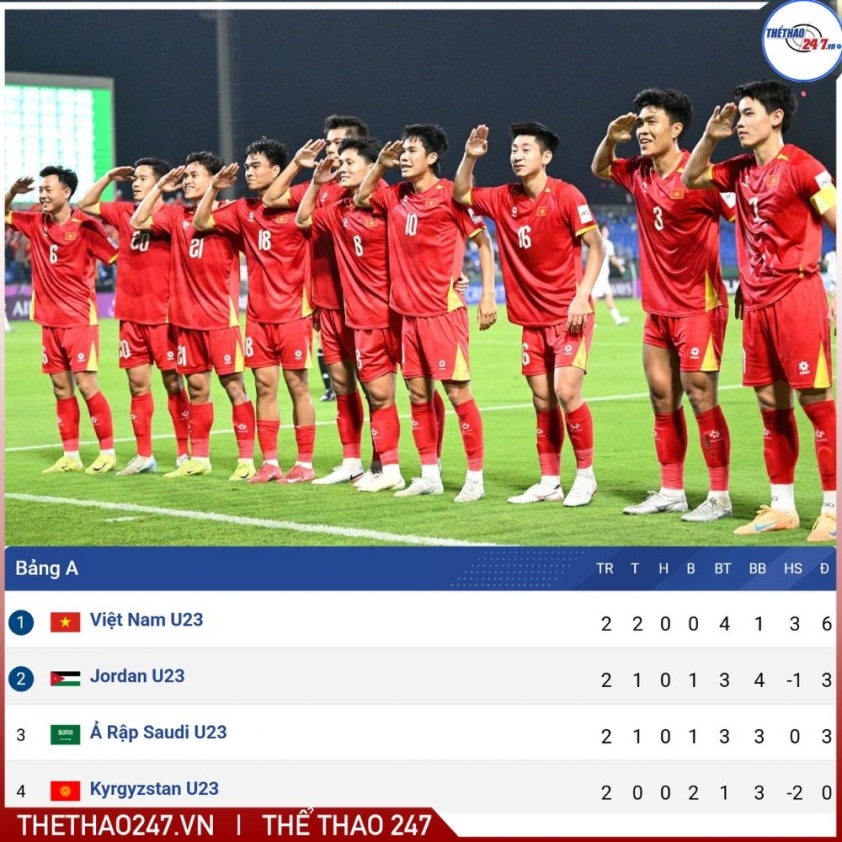 Sau 2 lượt trận, cục diện tại bảng A - VCK U23 châu Á 2026 vô cùng hấp dẫn. U23 Việt Nam đang dẫn đầu với 6 điểm, U23 Ả Rập Xê Út và U23 Jordan cùng sở hữu 3 điểm, trong khi U23 Kyrgyzstan có 0 điểm và xếp cuối. Mặc dù vậy, với việc thể thức và tiêu chí xếp hạng tại vòng bảng, cả 4 đội đều còn có hội vào tứ kết.