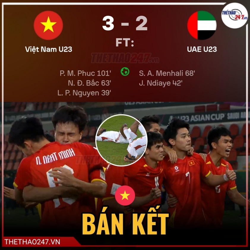 Hai đội buộc phải bước vào hiệp phụ để phân định thắng thua. Tại đây, Minh Phúc trở thành người hùng khi ghi bàn ở phút 101, qua đó mang về chiến thắng 3-2 đầy cảm xúc cho U23 Việt Nam và giúp đội giành quyền góp mặt tại bán kết U23 châu Á 2026.