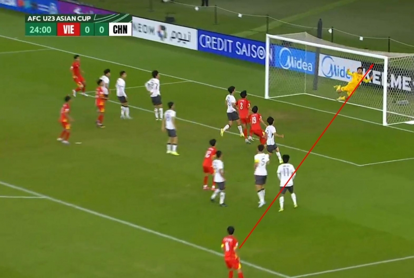 Tình huống dàn xếp đá phạt góc tốt của U23 Trung Quốc. Xiao Xiao dễ dàng đánh đầu cận thành ghi bàn mở tỷ số của trận đấu.