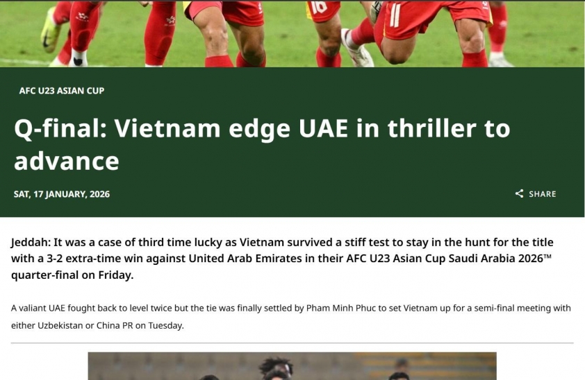 Trên trang chủ, AFC viết: "Đây là lần thứ 3 may mắn mỉm cười khi Việt Nam vượt qua thử thách cực kỳ khắc nghiệt để tiếp tục nuôi hy vọng vô địch, sau chiến thắng 3-2 trước UAE trong hiệp phụ ở trận tứ kết U23 châu Á Saudi Arabia 2026 diễn ra vào thứ Sáu”. Dòng nhận định này cho thấy AFC đánh giá rất cao tinh thần thi đấu kiên cường của thầy trò HLV Kim Sang Sik, đặc biệt trong bối cảnh U23 Việt Nam phải đối mặt với áp lực lớn từ đối thủ Tây Á.