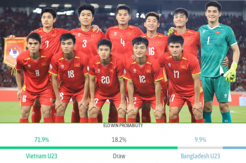 Trước thềm vòng loại U23 châu Á 2026, trận đấu giữa U23 Việt Nam và U23 Bangladesh đang nhận được nhiều sự chú ý. Theo mô hình dự đoán của chuyên trang Besoccer, thầy trò HLV Kim Sang Sik được đánh giá vượt trội với xác suất chiến thắng lên tới 71,9%, trong khi khả năng hòa là 18,2% và cơ hội thắng cho U23 Bangladesh chỉ là 9,9%.