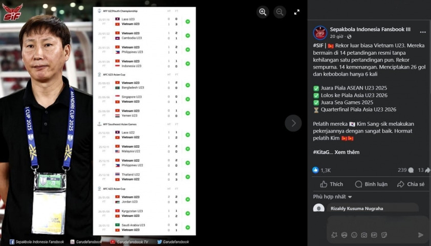 Chuỗi thành tích toàn thắng cùng tỷ lệ thắng 100% dưới thời HLV Kim Sang Sik đang giúp U23 Việt Nam trở thành tâm điểm chú ý của truyền thông châu Á, trong đó có Indonesia.Đây không chỉ là niềm tự hào lớn của bóng đá Việt Nam, mà còn là lời khẳng định mạnh mẽ về vị thế ngày càng được nâng cao của các đội tuyển trẻ Việt Nam trên bản đồ bóng đá khu vực và châu lục.