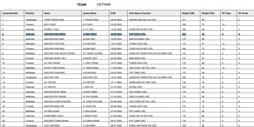 Thực tế, đây mới chỉ là bản danh sách tạm thời mà HLV Kim Sang Sik gửi lên Ban tổ chức theo yêu cầu, chưa phải danh sách cuối cùng. Theo quy định, các đội vẫn có quyền thay đổi danh chính thức trước 6 tiếng kể từ khi trận đấu đầu tiên của giải diễn ra.