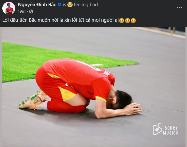 "Lời đầu tiên Bắc muốn nói là xin lỗi tất cả mọi người ạ," tiền đạo Nguyễn Đình Bắc vừa đăng tải dòng trạng thái trên trang cá nhân sau trận thua 0-3 của U23 Việt Nam trước U23 Trung Quốc.