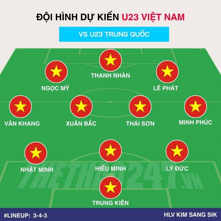 Theo các dự đoán, đội hình xuất phát của U23 Việt Nam có thể gồm Trung Kiên, Hiểu Minh, Nhật Minh, Lý Đức, Minh Phúc, Thái Sơn, Xuân Bắc, Văn Khang, Ngọc Mỹ, Lê Phát và Thanh Nhàn.