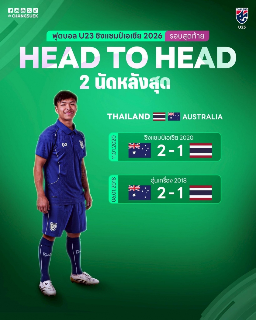 Ở kỳ U23 châu Á 2026, U23 Thái Lan bước vào giải đấu với nhiều kỳ vọng sau quá trình chuẩn bị khá tích cực. Tuy nhiên, việc chưa từng thắng U23 Australia trong quá khứ chắc chắn sẽ tạo ra áp lực không nhỏ cho thầy trò HLV Thawatchai ở trận ra quân. Ngược lại, U23 Australia có cơ sở để tự tin khi lịch sử đang đứng về phía họ, cùng chuỗi phong độ ổn định kéo dài thời gian qua.