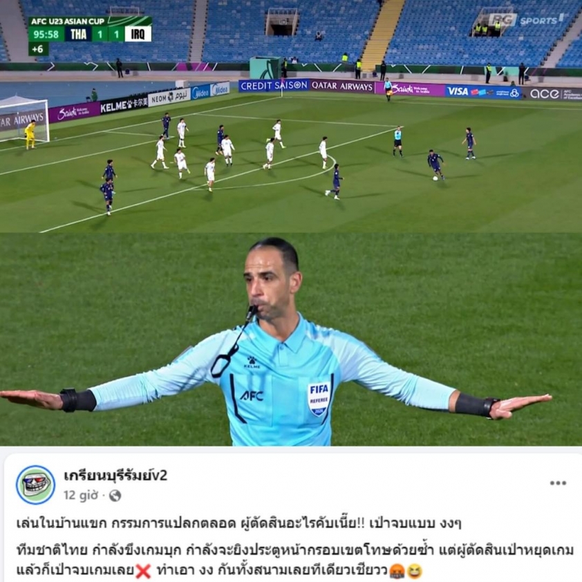 Truyền thông Thái Lan bức xúc chỉ trích trọng tài sau trận hòa 1-1 với U23 Iraq, đặc biệt ở tình huống thổi còi mãn cuộc khi U23 Thái Lan vẫn đang tổ chức tấn công.