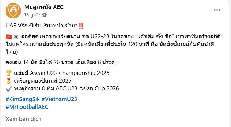 Theo thống kê được báo chí Thái Lan đăng tải, kể từ khi HLV Kim Sang-sik tiếp quản các đội tuyển trẻ Việt Nam, U22–U23 Việt Nam chưa thua bất kỳ trận đấu chính thức nào. Sau 14 trận, đội bóng giành chiến thắng tuyệt đối, ghi tới 26 bàn thắng và chỉ để lọt lưới 6 lần. Điều đặc biệt được truyền thông Thái Lan nhấn mạnh là trong toàn bộ chuỗi trận này, chỉ có duy nhất một trận đấu Việt Nam phải thi đấu 120 phút đó là trận chung kết SEA Games 2025 gặp chính U22 Thái Lan.