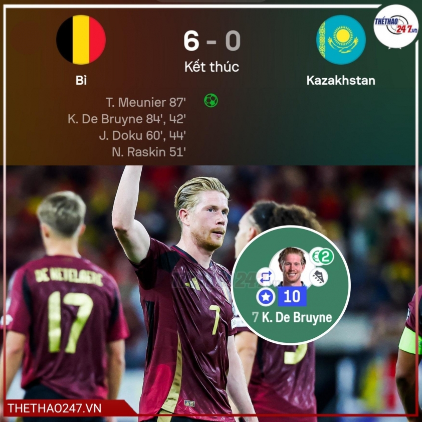 Cú đúp vào lưới ĐT Kazakhstan còn giúp De Bruyne vượt qua người đồng hương Eden Hazard trong danh sách các cầu thủ ghi bàn nhiều nhất lịch sử ĐT Bỉ. Ngôi sao của Napoli hiện có 34 bàn thắng, xếp sau Romelu Lukaku, người dẫn đầu danh sách này với 56 pha lập công.