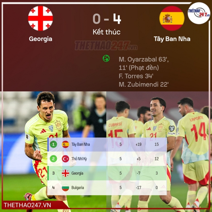 ĐT Tây Ban Nha đã tiến một bước dài tới mục tiêu tham dự World Cup 2026 với chiến thắng mới nhất trước Georgia ở lượt đấu thứ năm vòng loại.