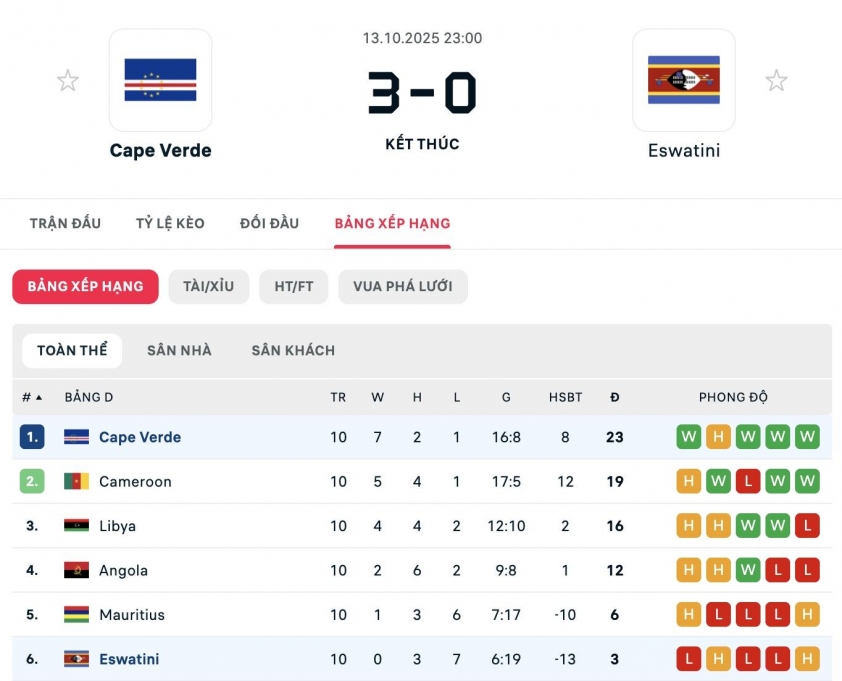 Thất bại duy nhất của Cape Verde trong bảng đấu là trận thua 1-4 trước Cameroon ở lượt trận thứ ba, nhưng trận hòa bất ngờ của Cameroon trước Libya, Eswatini và Angola, cùng với trận thua 0-1 trước Cape Verde vào tháng trước đã mang lại lợi thế cho đội bóng của quốc đảo nhỏ bé này.