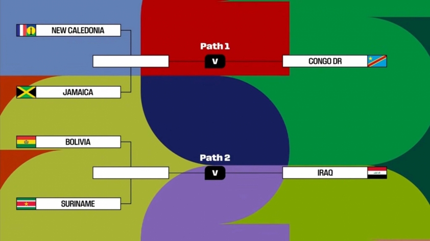 Trong khi các nhánh play-off châu Âu đã được xác định, sáu đội còn lại từ các châu lục khác sẽ cạnh tranh cho hai suất cuối cùng. Iraq và CH Congo (DR Congo) góp mặt với tư cách hạt giống và đã được xếp thẳng vào hai trận chung kết nhánh, còn New Caledonia, Jamaica, Bolivia và Suriname sẽ thi đấu để xác định hai đối thủ còn lại.