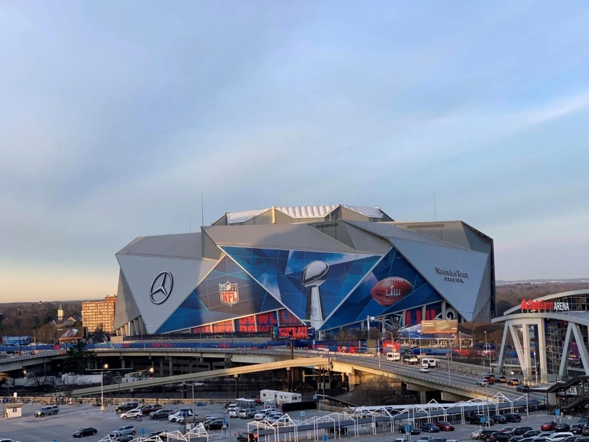 Trong số 11 sân vận động thuộc hệ thống NFL được chọn làm địa điểm thi đấu, nhiều nơi vẫn chưa tìm ra phương án khả thi để che chắn các khu vực mang yếu tố thương mại. Tình huống phức tạp nhất xảy ra tại sân Mercedes-Benz ở Atlanta.