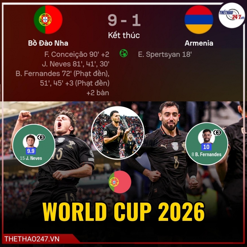 Bước sang hiệp hai, đoàn quân của HLV Roberto Martinez không có dấu hiệu giảm nhiệt. Bruno Fernandes có thêm bàn thắng nữa, trong khi Ramos, Joao Neves và Francisco Conceicao thay nhau lập công, mang đến chiến thắng 9–1 hủy diệt. Con số thống kê đã nói lên tất cả: Bồ Đào Nha tung ra 33 cú dứt điểm, kiểm soát bóng vượt trội và tạo ra sức ép nghẹt thở khiến Armenia gần như bất lực.