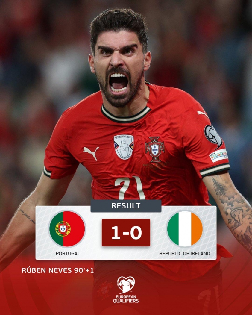 (Kết quả bóng đá) - Bồ Đào Nha vượt qua Ireland 1-0 trên sân nhà ở vòng loại World Cup 2026, nhờ pha lập công muộn màng của Ruben Neves phút 90+2 đầy kịch tính.