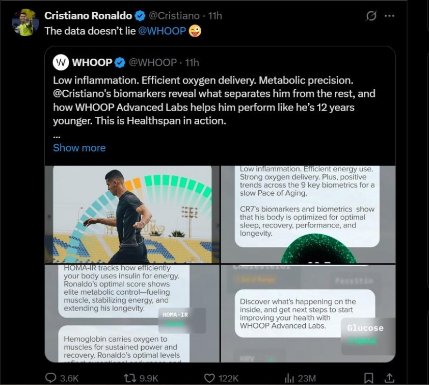 Trong quá trình chuẩn bị dẫn dắt tuyển Bồ Đào Nha chinh chiến tại Mỹ, Canada và Mexico vào mùa hè sang năm, Ronaldo đã hợp tác với WHOOP - đơn vị hỗ trợ theo dõi sức khỏe và thể trạng. Chỉ chưa đầy 24 giờ sau khi tiền đạo Al Nassr ghi siêu phẩm “xe đạp chổng ngược”, công ty này công bố kết quả cho thấy huyền thoại Real Madrid thi đấu như một cầu thủ trẻ hơn 12 tuổi.