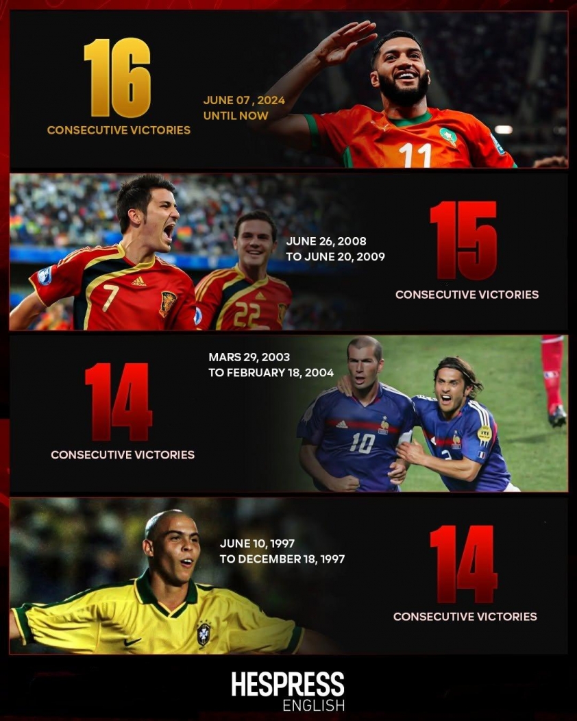 Theo thống kê từ Reuters, chuỗi 16 chiến thắng của Morocco bắt đầu kể từ sau trận hòa 0-0 trước Mauritania vào tháng 3/2024. Từ thời điểm đó đến nay, “Sư tử Atlas” đã thắng liền 7 trận vòng loại World Cup, 6 trận vòng loại Cúp châu Phi (AFCON) 2025 và 3 trận giao hữu quốc tế. Đáng chú ý, chuỗi trận này không bao gồm các trận đấu của đội tuyển B, đội hình chỉ gồm cầu thủ đang chơi tại giải quốc nội, từng vô địch Giải vô địch các quốc gia châu Phi (CHAN) tại Kenya hồi tháng 8 vừa qua.