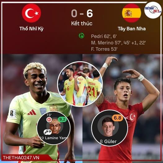 Chiến thắng 6-0 ấn tượng của Tây Ban Nha tại vòng loại World Cup 2026 đến vào sáng ngày 8/9. Bại tướng của họ là Thổ Nhĩ Kỳ - một đội bóng có lối chơi rất khó chịu nhưng đoàn quân của HLV Luis de la Fuente chẳng gặp nhiều vấn đề. 3 điểm và "Bò tót" có màn trình diễn hoàn hảo.