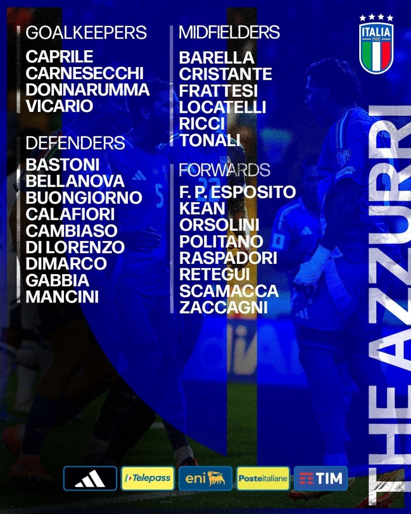 Trên trang cá nhân X, đội tuyển Ý đã công bố danh sách triệu tập cho đợt FIFA Days tháng 11, với một số gương mặt mới do HLV Gennaro Gattuso quyết định.