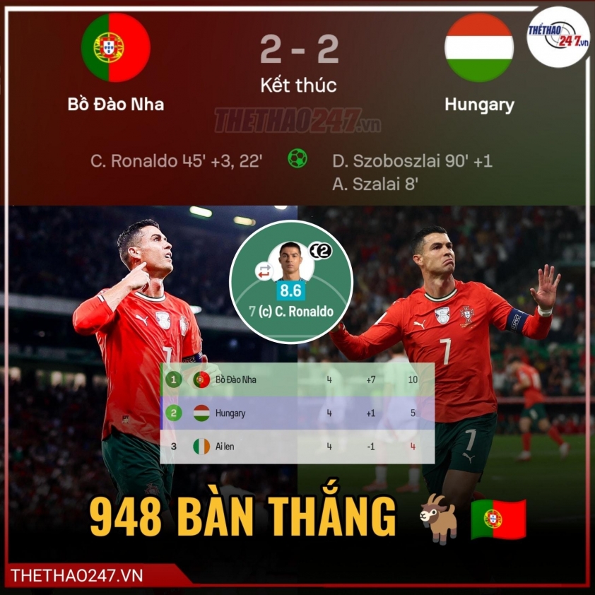 Cristiano Ronaldo tiếp tục chứng minh rằng tuổi tác chỉ là con số, khi lập cú đúp giúp tuyển Bồ Đào Nha cầm hòa Hungary 2-2 trong trận đấu kịch tính rạng sáng qua. Với hai pha lập công này, siêu sao 40 tuổi không chỉ giúp đội nhà giữ vững ngôi đầu bảng mà còn xác lập kỷ lục cầu thủ ghi nhiều bàn nhất lịch sử vòng loại World Cup, với 41 bàn thắng.
